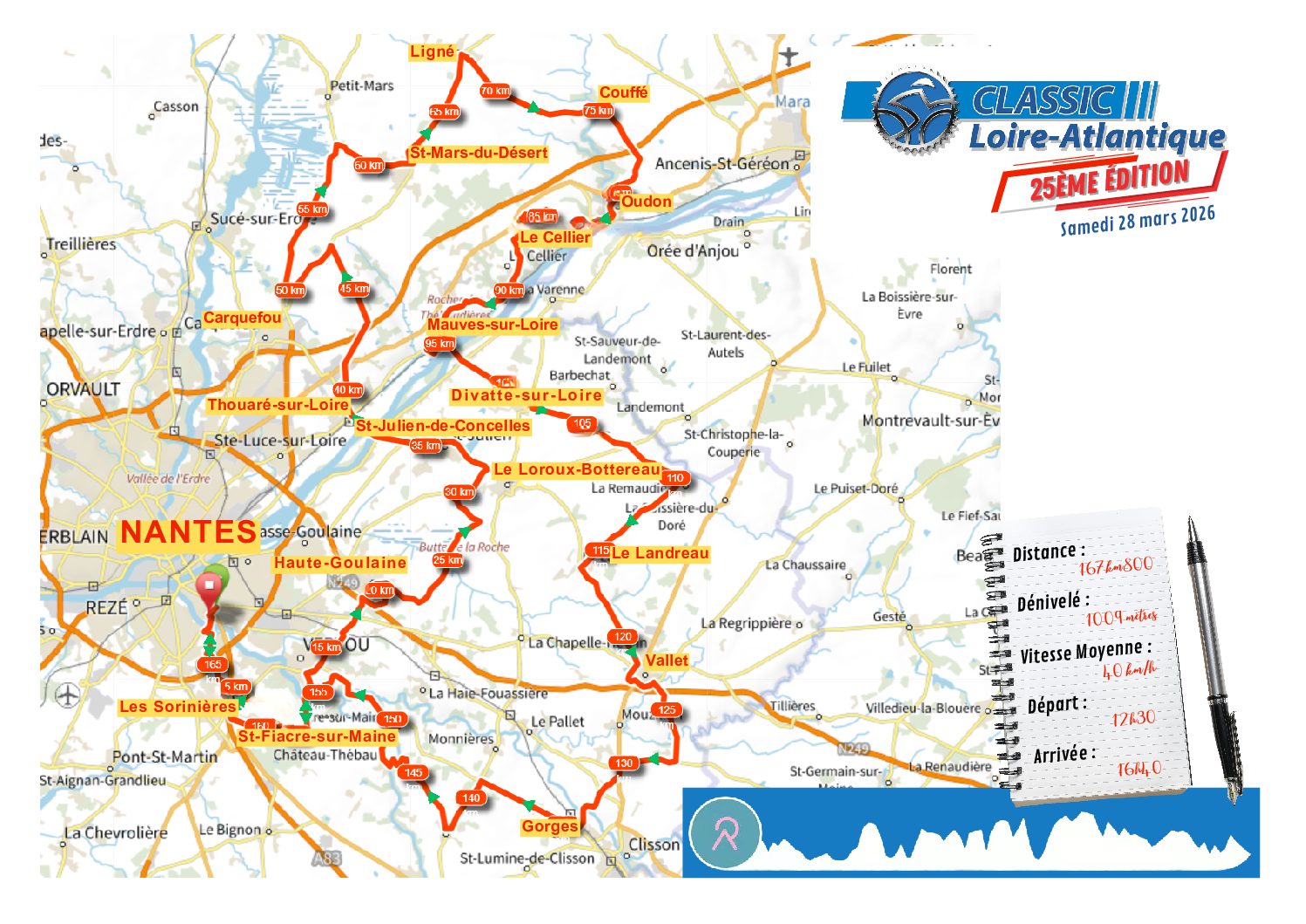 La 25ème édition de la Classic Loire-Atlantique revient avec le soutien de Nantes Métropole. Le parcours traverse 18 communes dans le paysage ligérien, un clin d’œil de l’organisation tout particulièrement pour le circuit de la Vallée de Loire où les coureurs passeront à Couffé (terre d’accueil depuis plusieurs années) puis emprunteront une partie du parcours avant de revenir sur les terres de la Classic et retrouver nos amis signaleurs de Maisdon sur Sèvre et le site de Pont Caffino de Château Thébaud.