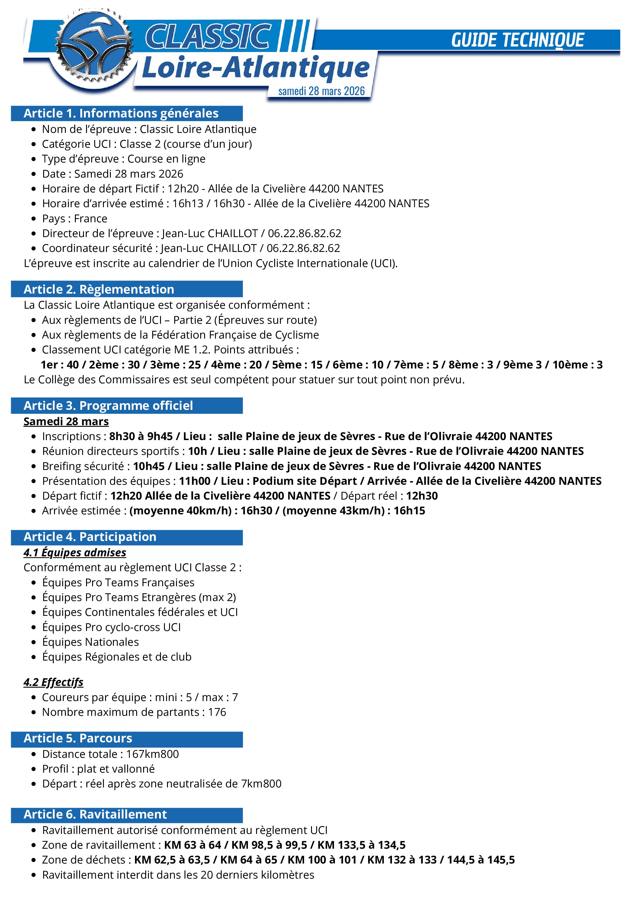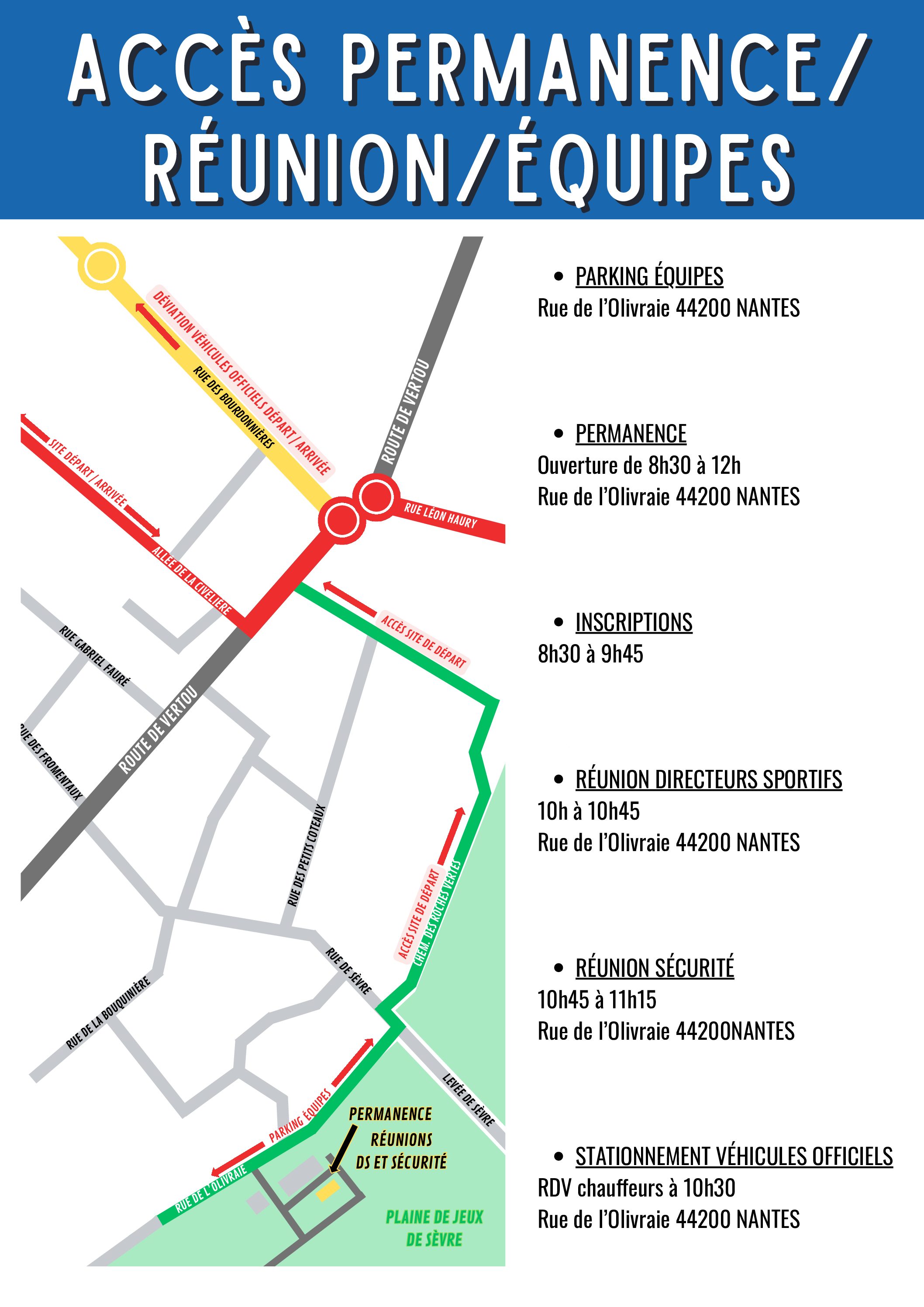 Présentation des équipes : 11h00 / Lieu : Allée de la Civelière – 44200 NANTES (Podium site Départ / Arrivée)